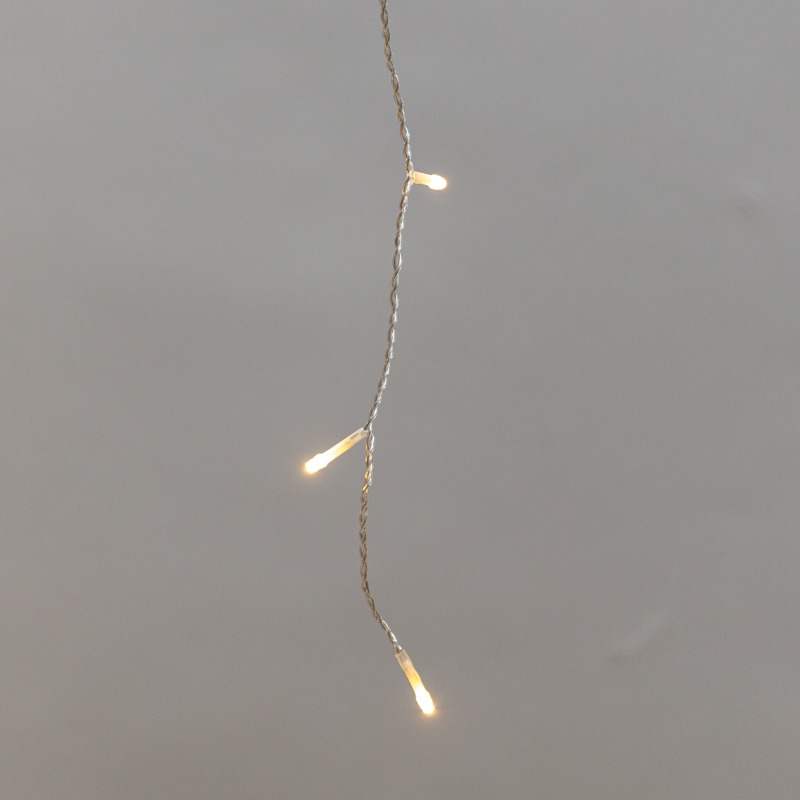 Светодиодная гирлянда Айсикл (Бахрома) представляет собой горизонтальный провод 5 м, на котором располагаются вертикальные нити разной длины от 30 до 60 см. Благодаря своей форме гирлянда оптимально подходит для оформления гардин, ниш, открытых проемов между комнатами, а также крыш, навесов, перил и других элементов зданий и ограждений. <br> Степень защиты IP44 позволяет использовать гирлянду как на открытом воздухе под навесом, так и внутри помещений.<br> На каждой нити располагаются светодиоды, создающие эффект сверкающих сосулек. Цвет свечения – теплый белый.<br> Прозрачный провод изделия делает светящиеся линии более выразительными и образует гармоничную яркую композицию.<br> Особенностью гирлянды является эффект мерцания, который добавляет динамики и создает магическую атмосферу.