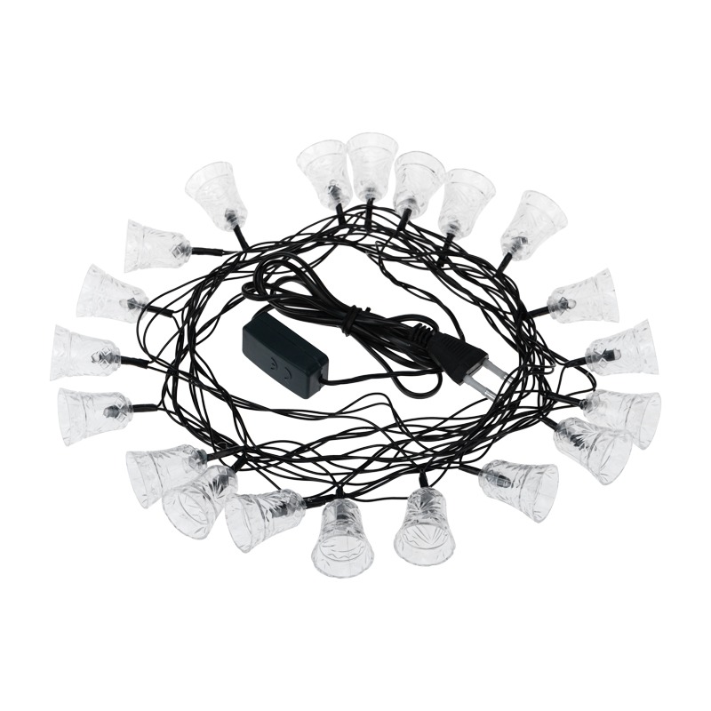 Светодиодная гирлянда «Колокольчики» длиной 2,8 метра станет прекрасным стилистическим украшением интерьера: темный кабель с оболочкой из зеленого ПВХ практически незаметен в декоре аналогичного тона — диоды создают эффект объемного свечения. Гирлянда подходит для создания акцентной подсветки в интерьере или используется в качестве самостоятельного декора отдельных предметов обстановки. 20 светодиодов, выполненных в виде колокольчиков, светятся разноцветными огнями, создавая атмосферу праздника и волшебства. Гирлянда имеет степень защиты IP20 и предназначена для использования в интерьере и сухих помещениях с умеренной влажностью. Гирлянда питается от электросети с напряжением до 230 Вольт.