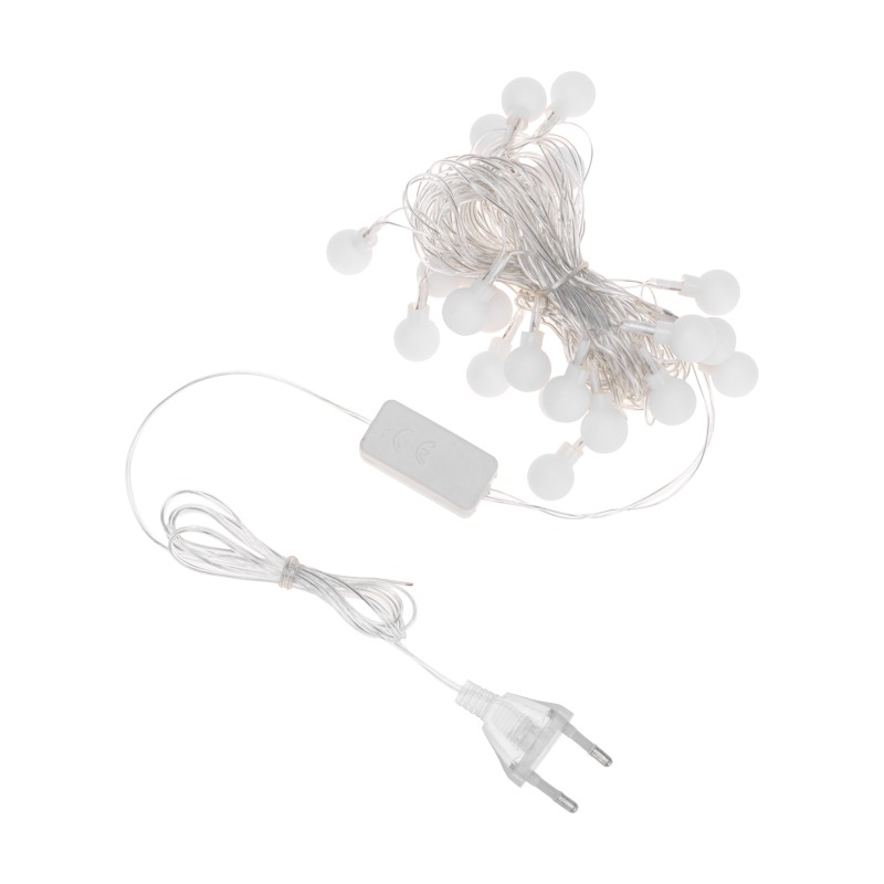 Светодиодная гирлянда Шарики длиной 5 метров выполнена в виде прозрачного ПВХ шнура с матовыми круглыми насадками, которые светятся разными цветами. Всего в гирлянде 20 светодиодов. <br> Экономичные светодиоды не перегорают со временем и не нагреваются, поэтому украшение будет долгое время радовать своих обладателей. <br> Изделие предполагает размещение внутри сухих отапливаемых помещений. Гирлянда питается от электросети с напряжением до 230 Вольт.
