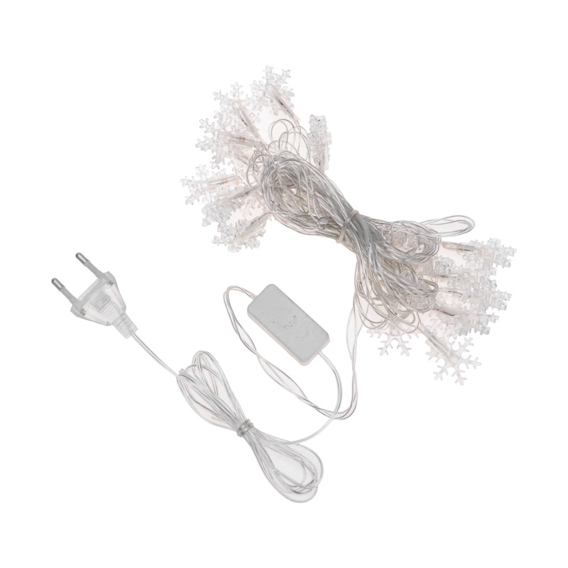Светодиодная гирлянда большие Снежинки— это оригинальное и эффектное решение для оформления интерьера в преддверии праздника. <br> Украшение выполнено в виде серебристого шнура в прозрачной ПВХ оболочке, на котором расположены насадки в виде снежинок. <br> 20 светодиодов, выполненных в виде колокольчиков, светятся разноцветными огнями, создавая атмосферу праздника и волшебства. <br> Гирлянда имеет степень защиты IP20 и предназначена для использования в интерьере и сухих помещениях с умеренной влажностью. Питание осуществляется от электросети с напряжением до 230 В.