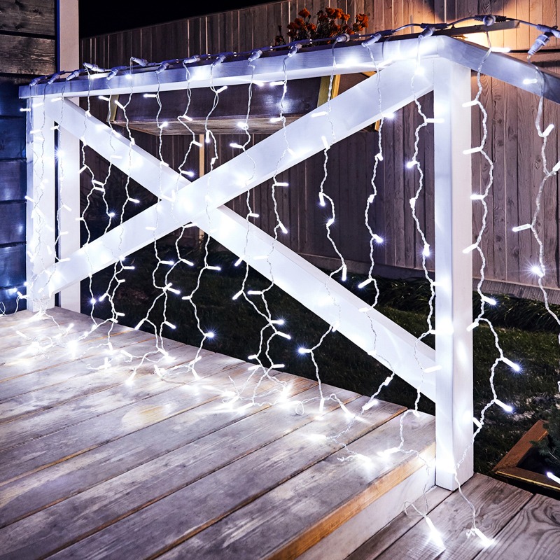 Гирлянда "Светодиодный Дождь" представляет собой гибкий горизонтальный шнур-шину (2м), к которому через определенные промежутки крепятся вертикальные нити (16 шт.) со светодиодными лампами, которые отличаются от «Бахромы» тем, что имеют одинаковую, достаточно значительную длину, часто превышающую протяженность шины. На концах каждой шины есть разъем и штепсель, которые предназначены для последовательного соединения нескольких световых дождей в большой занавес ПЛЕЙ-ЛАЙТ. Используя занавес, можно не только создавать красивые световые занавесы или оформлять различные плоскости, например, фасады домов, окна и т.д., но и украшать объемные объекты.