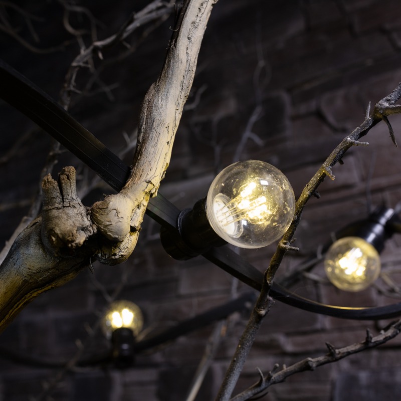 LED Galaxy Bulb String выполнена на основе гирлянды Белт-лайт и представляет собой готовый к использованию комплект с уже установленными в патроны 30 светодиодными лампами. Элементы диаметром 4,5 см излучают белый свет теплого оттенка. Шина выполнена из электрического провода длиной 10 метров, заключенного в изоляционную оболочку из морозостойкого, гибкого, прочного каучука черного цвета. Гирлянда имеет защиту по стандарту IP65 — не боится попадания водных брызг, летящих в любом направлении под давлением, поэтому подходит для размещения как дома, так и на улице. Диапазон рабочих температур –40...+50 °С.