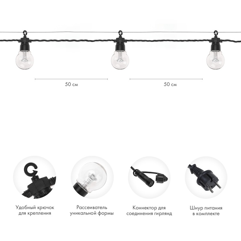 Уличная гирлянда Лофт представляет собой готовый к использованию комплект с уже установленными в патроны светодиодными лампами. Мягкое свечение достигается благодаря рассеивателю уникальной формы. Гирлянда выполнена из электрического провода длиной 10 метров, заключенного в изоляционную оболочку из морозостойкого, гибкого, прочного каучука черного цвета. Каждая лампа имеет удобный крючок для крепления на трос. Гирлянда защищена от влаги и пыли по стандарту IP65 и подходит для размещения на улице. На концах расположены влагозащищенные коннекторы, с помощью которых можно соединить гирлянду до 10 комплектов.