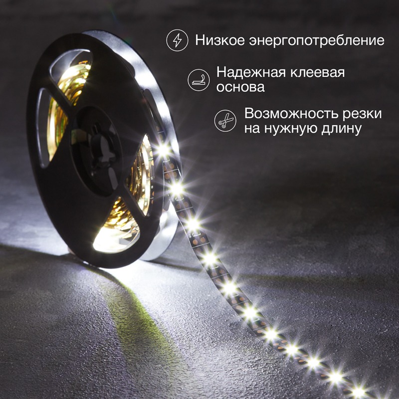 Светодиодная лента — гибкая лента на самоклеящейся основе, на которой установлены светодиоды. Может использоваться в подсветке интерьеров, изготовлении световых рекламных конструкций и пр. Работает от напряжения 12 В, поэтому при подключении к обычной бытовой сети 220 В потребуется источник питания 12 В. <br> <br> • Светодиодная лента 12 В поставляется в катушках длиной 5 м<br> • Следуя несложной инструкции, можно легко отрезать и подключить ленту нужной длины (модуль резки 50 мм). Монтаж ленты осуществляется вручную с помощью дополнительных аксессуаров (профиль, коннекторы, диммеры) и не требует специальной квалификации. Для более надежной фиксации ленты к поверхности можно использовать крепеж арт. 07-4207<br> • Степень влагозащиты IP65 — с влагозащитой, для установки вне помещений<br> • Цвет свечения — теплый белый<br> • 60 диодов/метр<br> • 6 Лм/диод