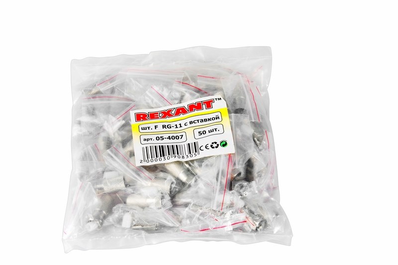 РАЗЪЕМ F-разъем RG-11 (с пином) REXANT предназначен для соединения магистрального коаксиального кабеля волновым сопротивлением 75 Ом с распределительными или оконечными устройствами (усилители, головные станции и т.п.). F-коннектор изготовлен из никелированного сплава меди (биметалл). Разъем устанавливается на кабель методом накрутки гильзы разъема на внешнюю оболочку кабеля, после соответствующей зачистки контактов, и не требует применения каких-либо специальных инструментов. Для перехода с жилы кабеля RG-11 на стандартный размер штекера используется специальная вставка (пин). F-штекер выступает в роли своеобразного экрана за счет накручивания на оплетку кабеля для выполнения роли электрического контакта.