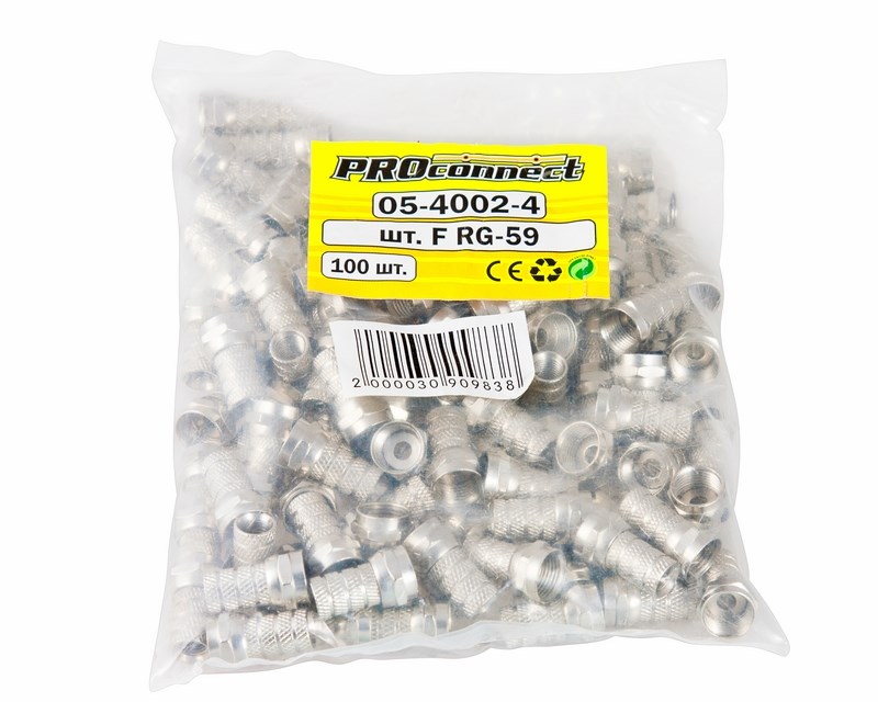 РАЗЪЕМ F-разъем RG-59 PROconnect предназначен для соединения коаксиального кабеля волновым сопротивлением 75 Ом с телевизионным и видеооборудованием (ресиверы, телевизоры, всевозможная видеоаппаратура и т.д.). Разъем данного вида не имеет непосредственного штекера, поэтому роль штекера выполняет центральная жила кабеля, что позволяет избежать дополнительных потерь сигнала. F-коннектор изготовлен из никелированного металла. Разъем устанавливается на кабель методом накрутки гильзы разъема на внешнюю оболочку кабеля после соответствующей зачистки контактов и не требует применения каких-либо специальных инструментов. F-штекер выступает в роли своеобразного экрана за счет накручивания на оплетку кабеля для выполнения роли электрического контакта.
