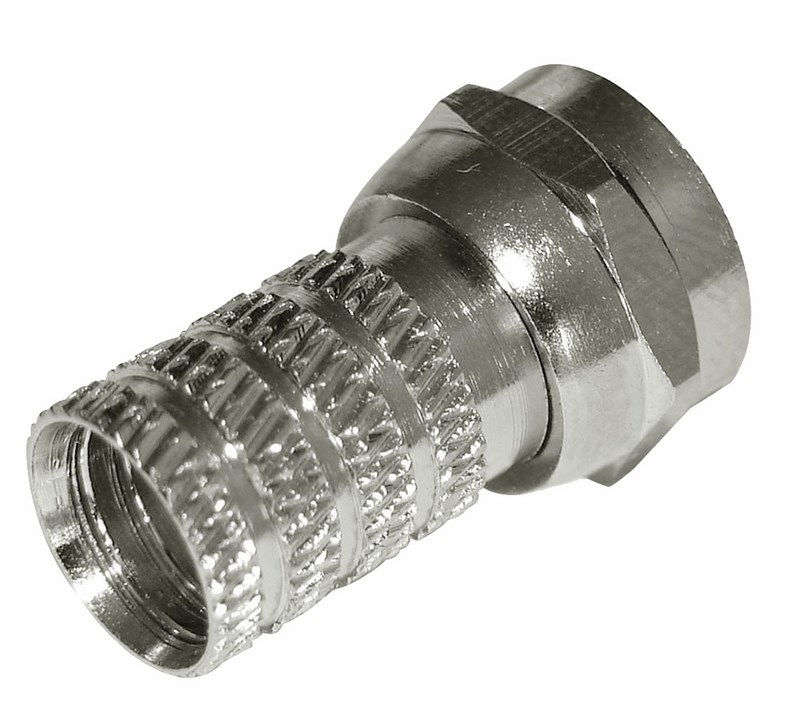 РАЗЪЕМ F-разъем RG-59 REXANT предназначен для соединения коаксиального кабеля волновым сопротивлением 75 Ом с телевизионным и видеооборудованием (ресиверы, телевизоры, всевозможная видеоаппаратура и т.д.). Разъем данного вида не имеет непосредственного штекера, поэтому роль штекера выполняет центральная жила кабеля, что позволяет избежать дополнительных потерь сигнала. F-коннектор изготовлен из никелированного сплава меди (биметалл). Разъем устанавливается на кабель методом накрутки гильзы разъема на внешнюю оболочку кабеля после соответствующей зачистки контактов и не требует применения каких-либо специальных инструментов. F-штекер выступает в роли своеобразного экрана за счет накручивания на оплетку кабеля для выполнения роли электрического контакта. Такой высокочастотный соединитель имеет ряд положительных преимуществ: