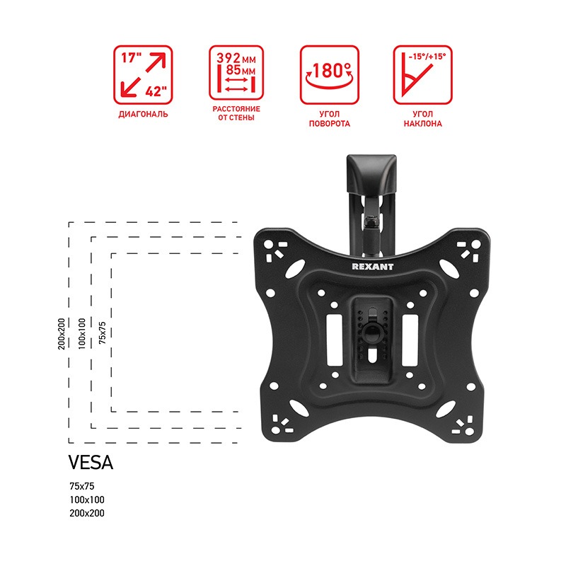 Кронштейн для телевизора 17"-42", наклонно-поворотный, 2 колена REXANT