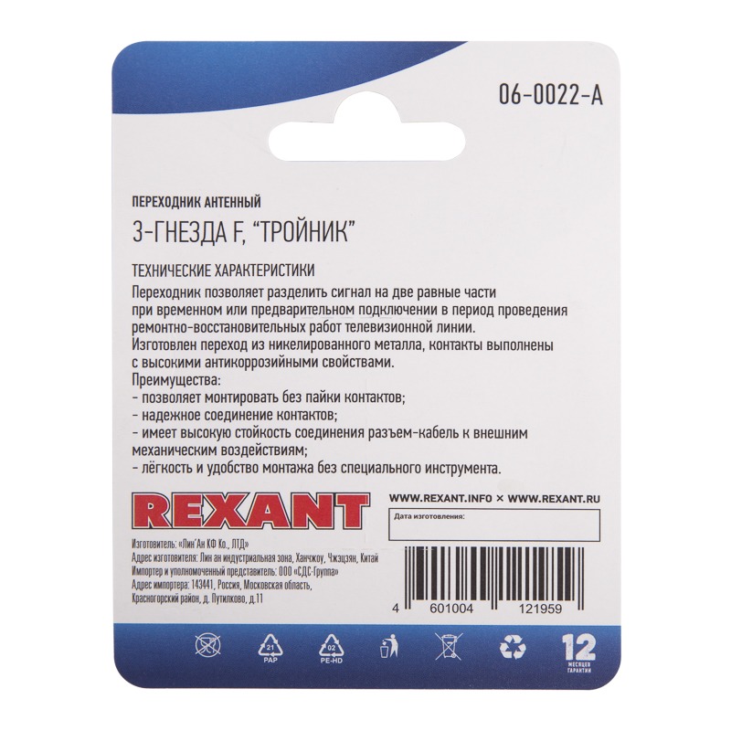 Переходник антенный, (3-гнезда F), тройник, (1шт) REXANT