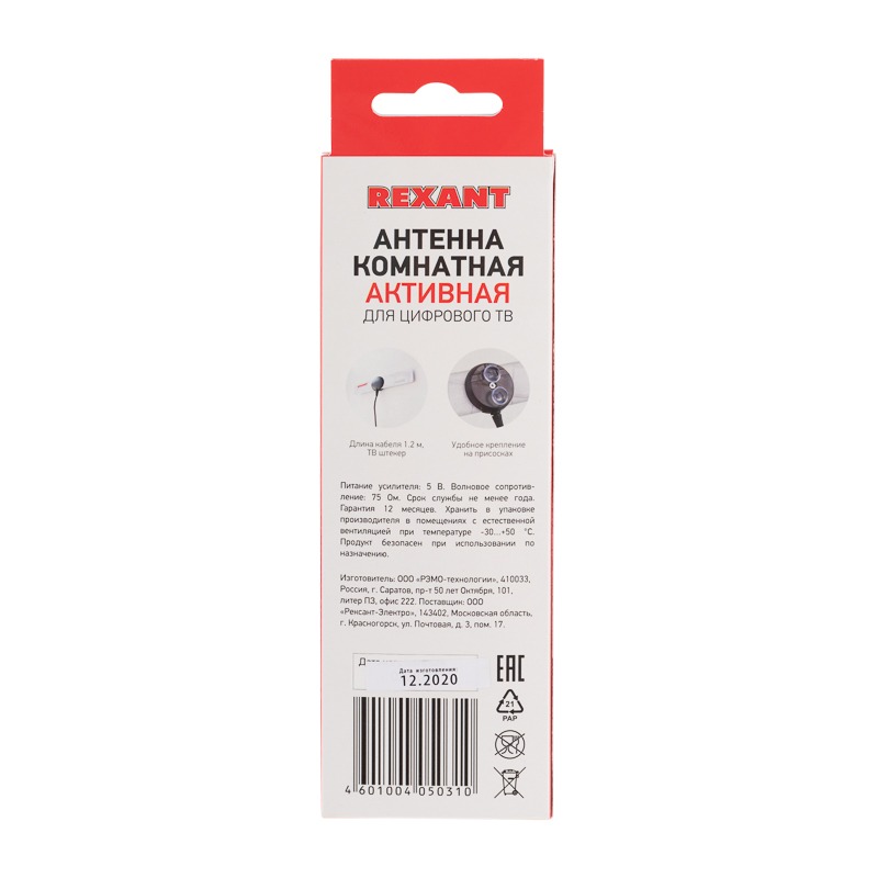 ТВ антенна комнатная «Активная» для цифрового телевидения DVB-T2 на присоске, RX-257 REXANT