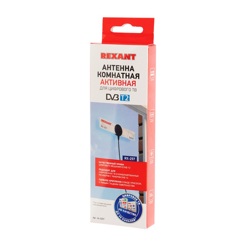 Антенна активная (со встроенным усилителем), комнатной установки, предназначена для приема цифрового эфирного ТВ вещания в стандарте DVB-T2.