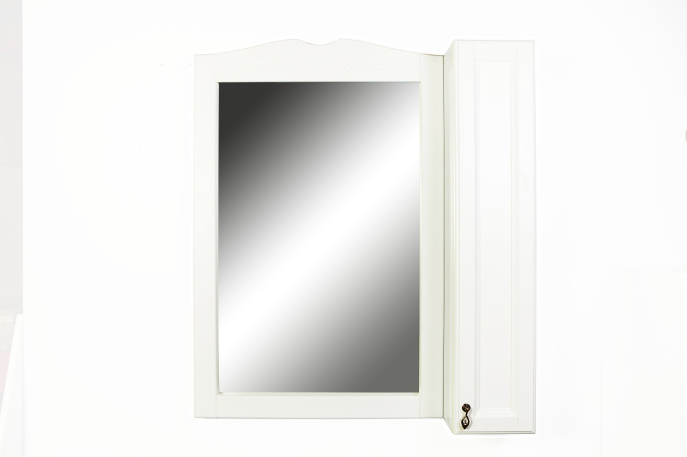 Зеркальный шкаф Orange Классик правый. Фасад зеркальное полотно и массив бука. Корпус - массив бука. Покрытие эмаль в цвете матовый молочный белый. Дверца с механизмом доводчика, обеспечивающим плавное закрывание. Подсветка, встроенная сверху (светодиодная, 10 Вт), с электровыключателем (механической кнопкой). Фурнитура в цвете бронза. В комплекте внутренняя полочка.