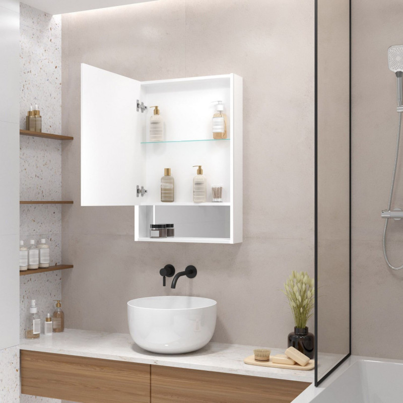 Оснащение: зеркало-шкаф, провод белый с вилкой 1м, розетка, навес, коробка, инструкция