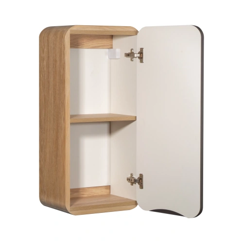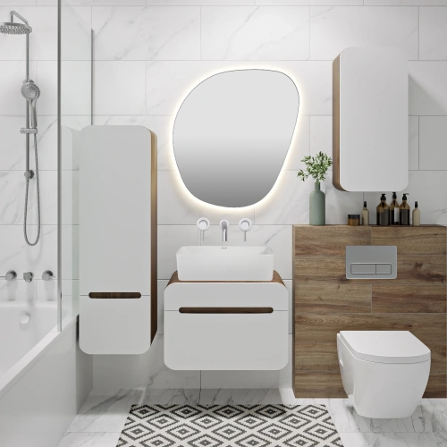 Шкаф навесной для ванной RUNO НИЦЦА - сочетание безупречного стиля и современных тенденций в дизайнерском оформлении ванной комнаты.Пенал с обтекаемыми формами станет прекрасным дополнением в интерьере Вашей ванной комнаты, выполнен в сочетании корпуса с текстурой темного дерева с белыми фасадами. Плавные линии в сочетании с фактурным покрытием сделают обстановку вашей ванной максимально теплой и уютной. Придаст изысканность и завершенность домашней обстановке. Шкаф оснащен одной распашной дверцей правого открывания и выдвижным ящиком с бесшумными шариковыми направляющими полного выдвижения, навесами для крепления к стене. Внутри шкафа две внутренние полки. Функцию ручки выполняет декоративный вырез. Фасады и корпус шкафа изготовлены из МДФ. Мебель для ванной RUNO - красота и практичность в мелочах! Цвет товара на мониторе может отличаться от реальных цветов, это зависит от настроек цветового профиля и разрешения Вашего монитора или мобильного устройства.