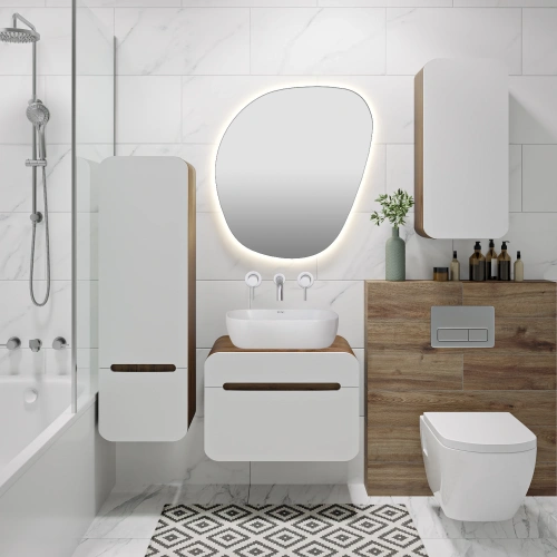 Шкаф-пенал для ванной RUNO НИЦЦА - сочетание безупречного стиля и современных тенденций в дизайнерском оформлении ванной комнаты. Пенал с обтекаемыми формами станет прекрасным дополнением в интерьере Вашей ванной комнаты, выполнен в сочетании корпуса с текстурой темного дерева с белыми фасадами. Плавные линии в сочетании с фактурным покрытием сделают обстановку вашей ванной максимально теплой и уютной. Придаст изысканность и завершенность домашней обстановке. Шкаф оснащен одной распашной дверцей правого открывания и выдвижным ящиком с бесшумными шариковыми направляющими полного выдвижения, навесами для крепления к стене. Внутри шкафа две внутренние полки. Функцию ручки выполняет декоративный вырез. Фасады шкафа-пенала изготовлены из МДФ. Мебель для ванной RUNO - красота и практичность в мелочах! Цвет товара на мониторе может отличаться от реальных цветов, это зависит от настроек цветового профиля и разрешения Вашего монитора или мобильного устройства.