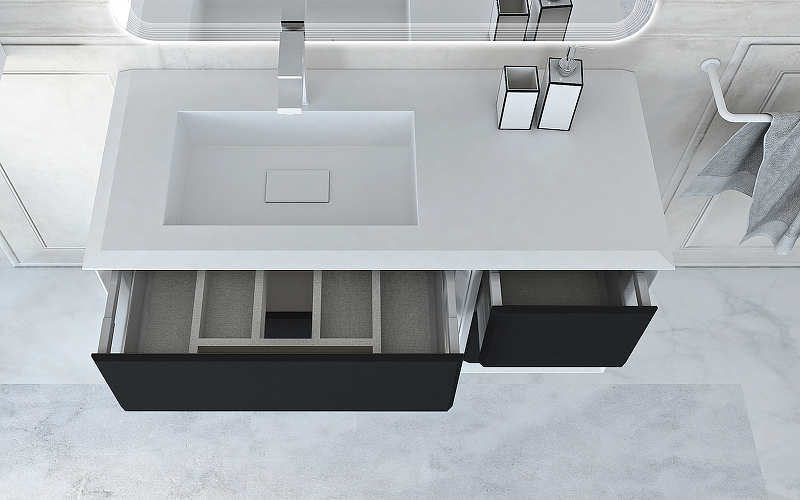 Совместима с базой под раковину. Оснащена выдвижными ящиками с доводчиками.
