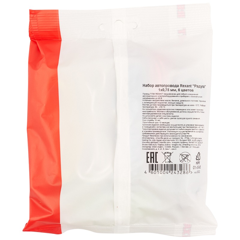 Набор автопровода REXANT «Радуга» 1х0,75 мм, 6 цветов (белый, желтый, зеленый, красный, синий, черный) по 3 метра