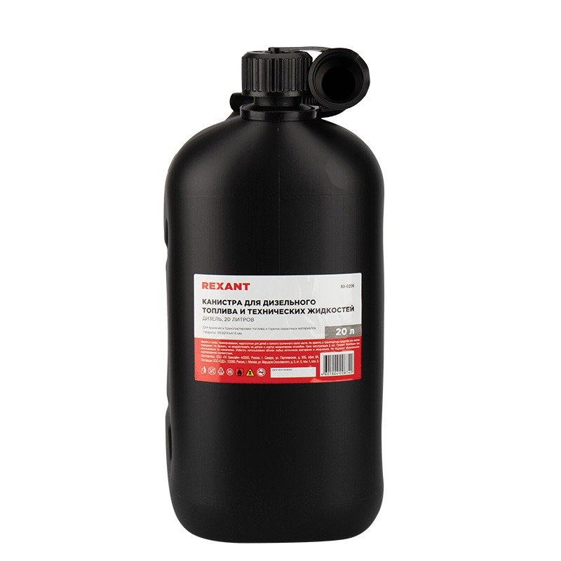 Канистра REXANT Дизель объемом 20 л предназначена для хранения и транспортировки дизельного топлива и других горюче-смазочных материалов. Изготовлена из высококачественного прочного (первичного в производстве) полиэтилена (ПЭНД). Имеет международный сертификат соответствия перевозки легковоспламеняющихся грузов, наличие которого дает возможность заправлять канистру на любых АЗС, находящихся на территории РФ и ЕС. Изделие имеет: боковые ребра жесткости, черный цвет (на котором не видно разводов от дизельного топлива), широкую уздечку держания заливного шланга (которая не прокручивается вместе с крышкой и не ломается на морозе), выемку на дне изделия для руки, эргономичную широкую ручку, усиленный шов на дне, детскую защиту на крышке, широкую горловину для залива и заправки, гофрированный гибкий шланг с системой «антибульк», маслобензостойкий уплотнитель на крышке, антистатические присадки, дополнительную ручную обработку швов и горловины.