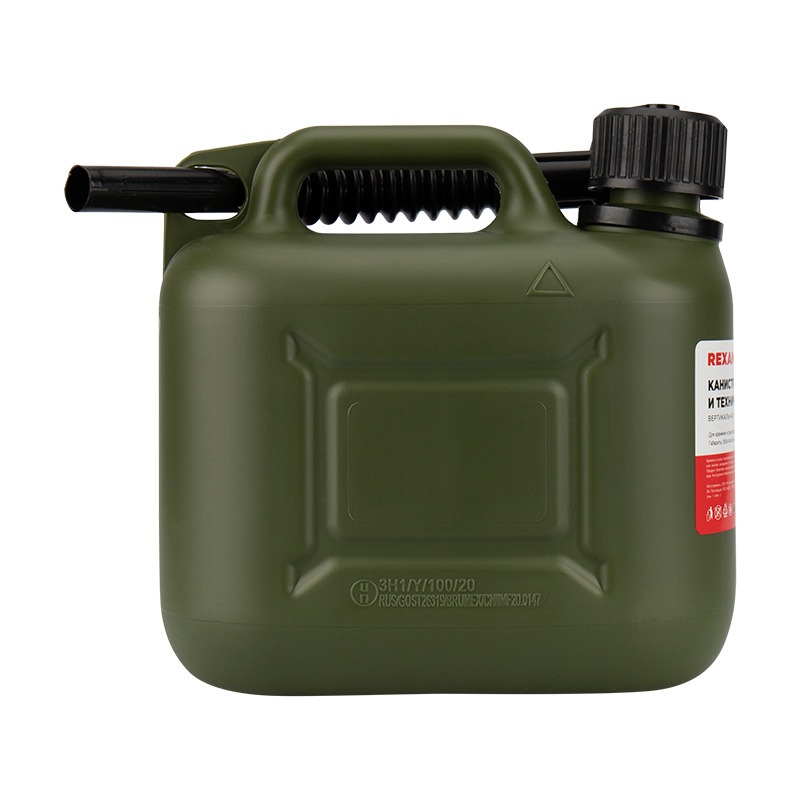 Вертикальная усиленная канистра REXANT объемом 5 л предназначена для хранения и транспортировки топлива и горюче-смазочных материалов. Изготовлена из высококачественного прочного (первичного в производстве) полиэтилена (ПЭНД). Имеет международный сертификат соответствия перевозки легковоспламеняющихся грузов, наличие которого дает возможность заправлять канистру на любых АЗС, находящихся на территории РФ и ЕС. Изделие имеет: боковые ребра жесткости, утолщенные стенки (которые позволяют выдержать высокие нагрузки при экстремальных условиях эксплуатации), зеленый цвет изделия, широкую уздечку держания заливного шланга (которая не прокручивается вместе с крышкой и не ломается на морозе), выемку на дне изделия для руки, эргономичную широкую ручку, усиленный шов на дне, детскую защиту на крышке, широкую горловину для залива и заправки, гофрированный гибкий шланг с системой «антибульк», маслобензостойкий уплотнитель на крышке, антистатические присадки, дополнительную ручную обработку швов и горловины.