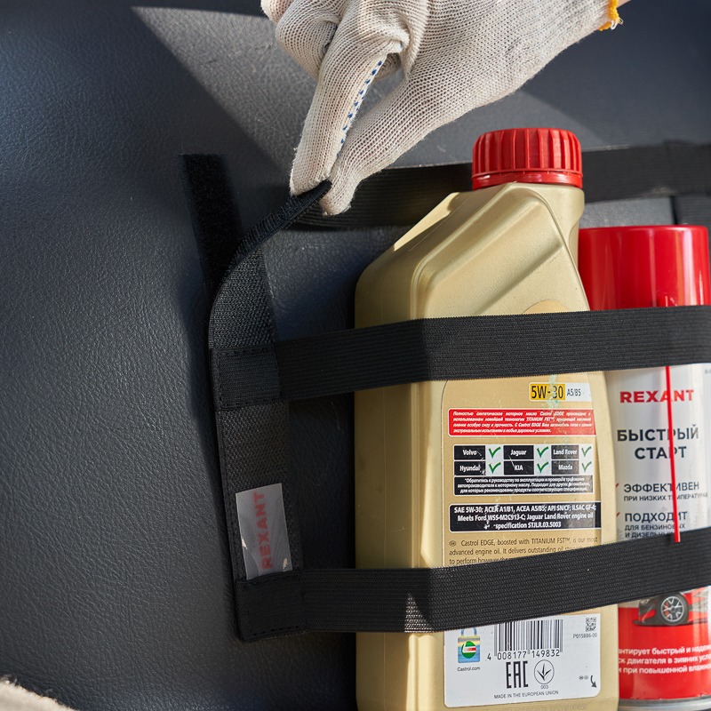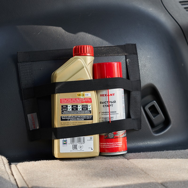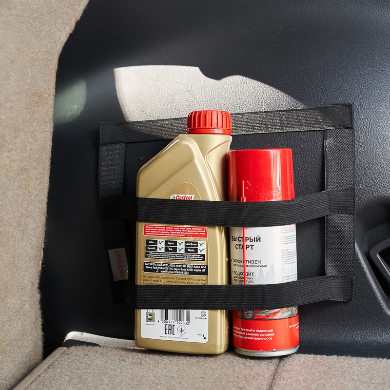 Карман надежно прикрепляется к ворсовому покрытию багажника при помощи липучки и предназначен для фиксации различного рода предметов, таких как огнетушители малых объемов, баллоны с автохимией, браслеты противоскольжения, аптечки, перчатки, салфетки и т. п.