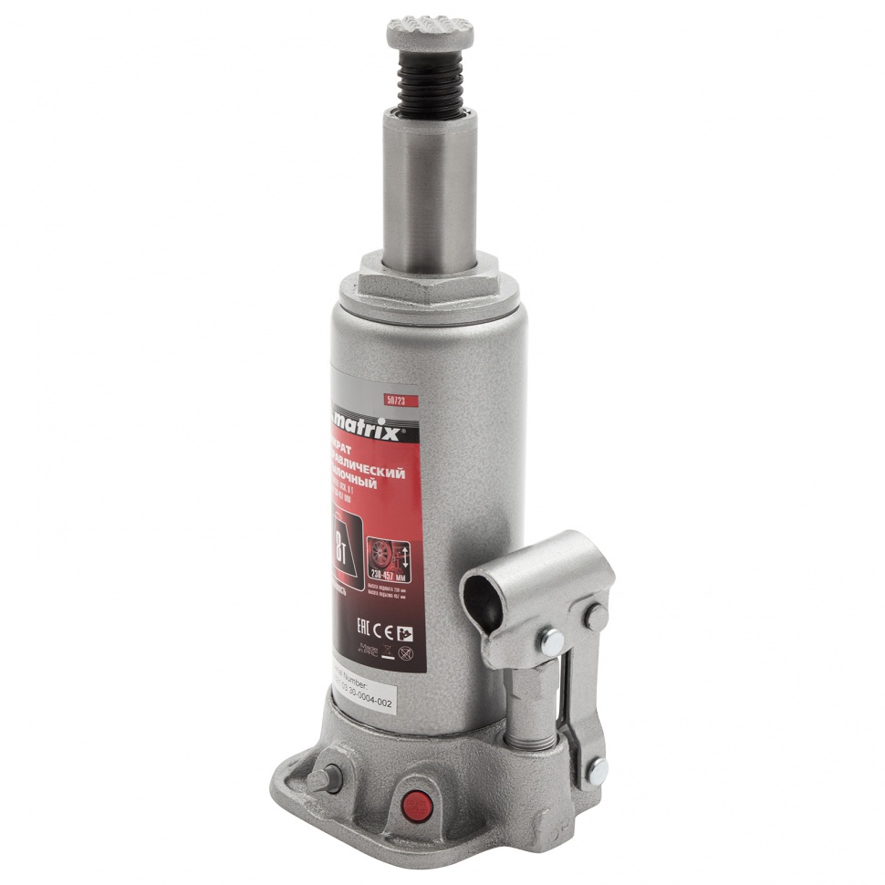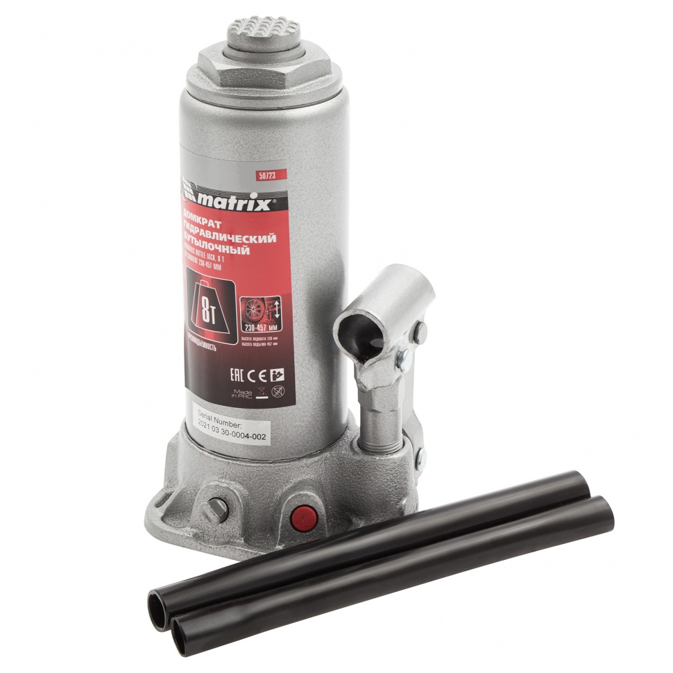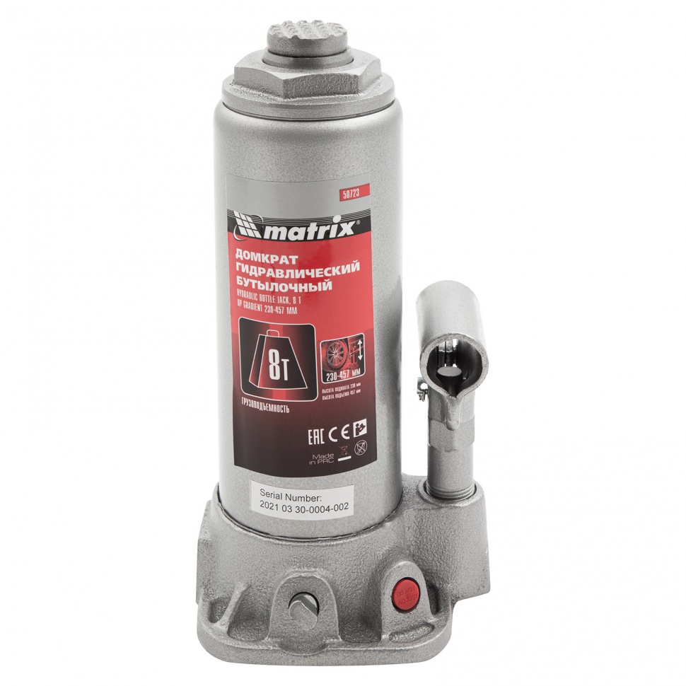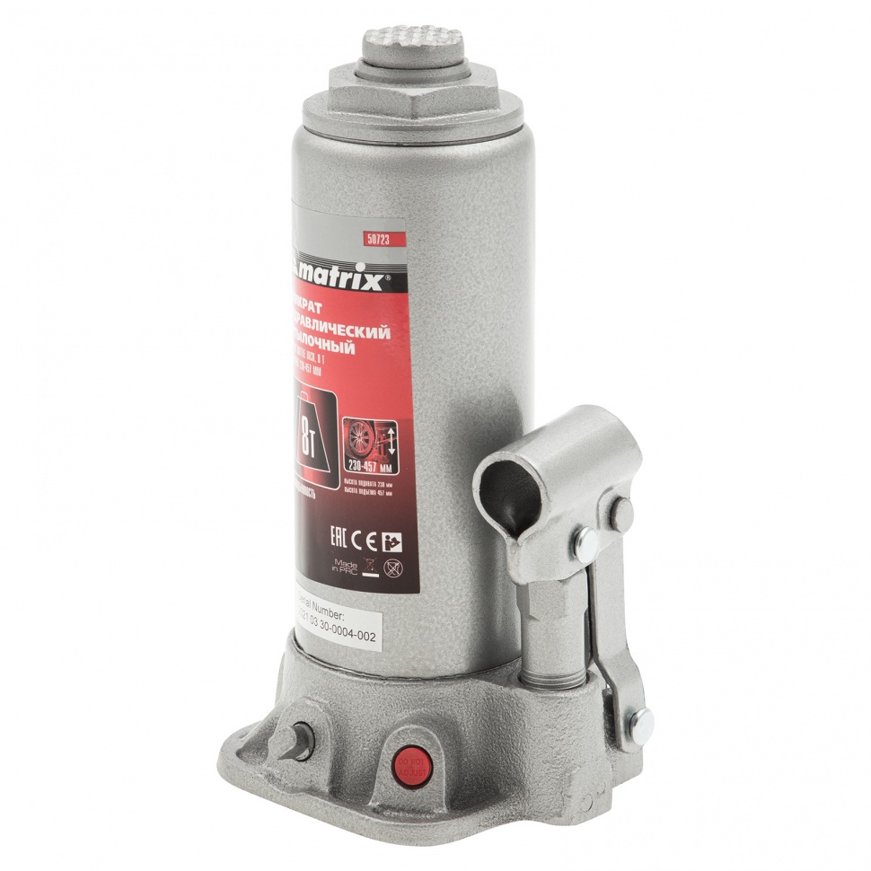 Гидравлический бутылочный домкрат Matrix 50723 используется для поднятия и фиксации грузов весом до 8 т на высоту 230-457 мм. Он подходит для автомобилей с высоким клиренсом. Домкрат станет незаменимым помощником для автолюбителей в гараже и дороге, а также для профессионалов на СТО.
