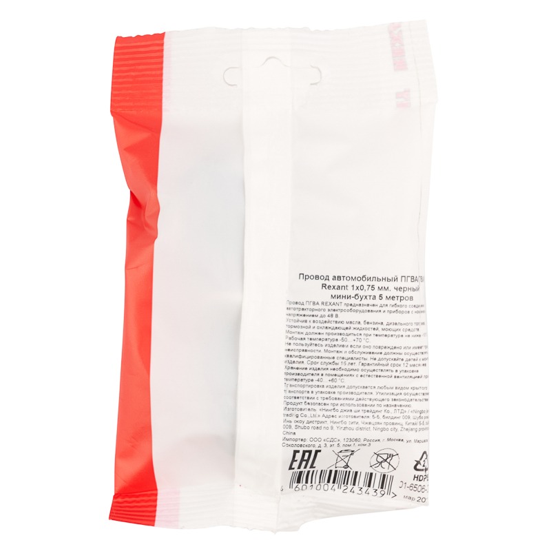 Провод автомобильный ПГВА/ПВАМ REXANT 1х0,75 мм черный, мини-бухта 5 метров