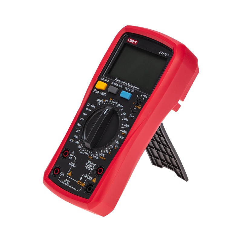 Автомобильный тестер UNI-T UT107. UT105 — прибор, специально разработанный для снятия автомобильных показателей. С его помощью можно измерять число оборотов коленчатого вала, угол замкнутого состояния контактов прерывателя трамблера, сопротивление, постоянное и переменное напряжение, постоянный и переменный ток, диод, звуковое устройство и транзистор. Данный прибор — незаменимый помощник при обслуживании и ремонте автомобиля. <br> <br> <br> Диапазоны измерений:<br> Постоянное напряжение: 200 мВ/2 В/20 В/1000 В<br> Переменное напряжение: 200 В/750 В<br> Постоянный ток: 200 мА/10 А<br> Сопротивление: 200 Ом/2 кОм/20 кОм/200 кОм/20 МОм<br> Частота: 2 кГц<br> Температура: –40~1000 °С<br> Коэффициент заполнения: 1~90 %<br> <br> Основные рабочие функции:<br> Разрядность дисплея: до 2000<br> Тестирование аккумуляторных батарей: 12 В<br> Прозвонка межсоединений со звуковым сигналом, диодный тест<br> Индикация перегрузки, отрицательной полярности, разряда батареи<br> Сохранение показаний DATA HOLD<br> Измерение угла опережения зажигания и скорости вращения двигателя<br> Питание: 9 В (6F22 «Крона»)