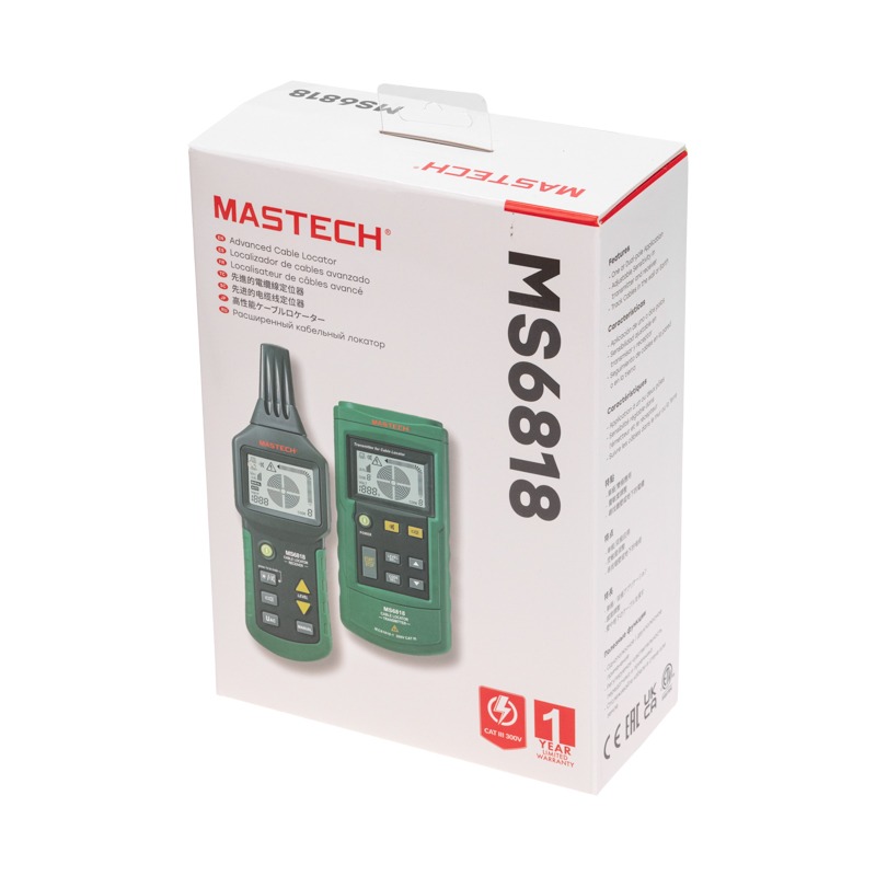 Кабельный локатор MASTECH MS-6818 — это профессиональный прибор для поиска скрытой проводки или кабеля в стенах, позволяющий определять <br> места разрывов и коротких замыканий в скрытой проводке, кабелях, теплом полу. По другому называется детектором скрытой проводки. <br> Аналогичен по функционалу прибору FLUKE 2042.<br> <br> Основные функции прибора:<br> - Обнаружение кабелей, электропроводки, труб подачи воды и газа, скрытых в стенах или земле.<br> - Обнаружение мест обрывов и коротких замыканий в кабелях и электропроводке, скрытых в стенах или земле.<br> - Обнаружение предохранителей и определение маршрутов электрических цепей.<br> - Отслеживание розеток и распределительных розеток, случайно закрытых штукатуркой.<br> - Обнаружение обрывов и коротких замыканий в проводке теплых полов.<br> - Приемник объединен с вольтметром переменного и постоянного напряжения, позволяющим измерять напряжение в диапазоне от 12 до 400 В.<br> <br> Переменное напряжение ~: 12–400 В (50-60 Гц), ±2,5%<br> Постоянное напряжение: 12–400 В, ±2,5%<br> Отображение на дисплеях приборов: уровня мощности, кода, остаточной емкости батареи, напряжения в кабеле<br> Настраиваемая чувствительность приемника <br> Подсветка рабочей зоны и подсветка дисплея<br> <br> Технические характеристики приемника:<br> Глубина обнаружения:<br> - в однополюсном режиме: 0-2 м<br> - в двухполюсном режиме: 0-0,5 м<br> Дальность - в режиме одноконтурной линии: до 2,5 м<br> Батарея: 1,5 В (тип АА, 4 шт.)<br> Вес (с батареей): 275 г<br> Габариты: 241х78х38 мм <br> <br> Технические характеристики генератора:<br> Частота выходного сигнала: 125 кГц<br> Идентификация внешнего напряжения: DC/AC 12-400 В<br> В комплекте: генератор и приемник <br> Батарея: 1,5 В (тип ААА, 6 шт.)<br> Вес (с батареей): 420 г<br> Габариты: 190х89х42 мм