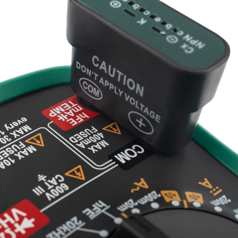 С помощью данного прибора можно проводить тестирование диодов, прозвонку целостности цепи и измерение коэффициента усиления транзисторов. Также мультиметр MS8360C оборудован специальным датчиком, с помощью которого вы бесконтактно сможете определить есть ли напряжение на участке, например в розетке, если есть необходимость демонтировать ее, то с помощью данного мультиметра вы сможете сразу узнать, если ли в ней напряжение. Таким образом, один прибор сможет заменить сразу несколько устройств одновременно.