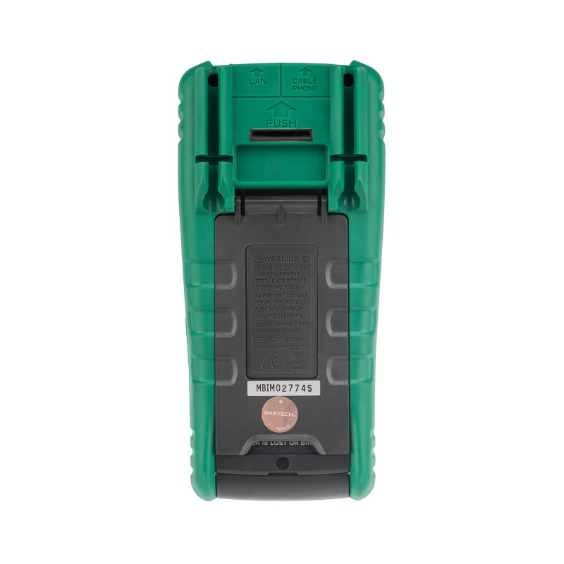 Многопозиционный круговой переключатель служит для выбора единиц измерения и функций кабельного тестера. Измерительные провода подключаются к входным терминалам, расположенным в нижней части корпуса. Кабельный тестер используется для идентификации и прозвонки жил внутри кабеля без удаления изоляции, а также проверки работоспособности телефонной линии. Для этого к прибору через разъем, расположенный в торце прибора, подключается специальный кабель из комплекта поставки. Он состоит из красного и черного провода с «крокодилами» и четырехжильного коннектора телефонной сети. Для идентификации тонового сигнала используется пробник из комплекта поставки. При обнаружении сигнала он будет издавать звуковой сигнал.