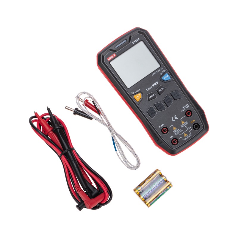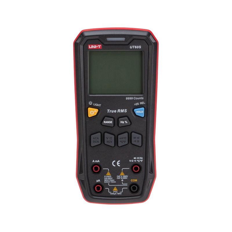 Профессиональный TRUE RMS мультиметр UNI-T UT60S применяется для измерения постоянного/переменного напряжения до 1000В, силы тока до 10А, сопротивления до 100Мом и температуры с большим разрешением и точностью. В приборе используются только кнопочные выключатели и переключатели для изменения функций и параметров. <br> Большой дисплей на 9999 разрядов с подсветкой облегчает считывание результатов при слабом внешнем освещении. Функция удержания данных DATA HOLD обеспечивает удобство при работе в местах с ограниченным доступом. Выбор диапазона измерения производится автоматически.<br> Прибор имеет режимы относительных измерений и прозвонку межсоединений со звуковым сигналом.<br> Синхронизация с мобильными устройствами, звуковая и световая индикация (NCVпрозвонкамощность батареи), проверка диодов, автоматическое отключение (15 мин), бесконтактный детектор напряжения NCV – все это объединяет в себе мультиметр UNI-T 60S.<br> <br> Характеристики:<br> Постоянное напряжение: 9.999mV/99.99mV/999.9mV/9.999V/99.99V/999.9V ± (0.5%+3)<br> Переменное напряжение: 9.999mV/99.99mV/999.9mV/9.999V/99.99V/999.9V ± (0.8%+3)<br> Постоянный ток: 999.9uA/999.9mA/9.999A/10A ± (0.8%+3)<br> Переменный ток: 999.9uA/999.9mA/9.999A/10A ± (1.0%+3)<br> Сопротивление: 999.9Ω/9.999kΩ/99.99kΩ/999.9kΩ/9.999MΩ/99.99MΩ ± (0.8%+2)<br> Емкость: 9.999nF/99.99nF/999.9nF/9.999μF/99.99μF/999.9μF/9.999mF ± (4.0%+5)<br> Частота: 99.99Hz~9.999MHz ± (0.1%+5)<br> Коэффициент заполнения (скважность): 0.1~99.9% ± (3%+5)<br> Температура: -40...1000 °C ±4℃/±5℉<br> Питание: 3 батареи ААА<br> Габаритные размеры: 169 x 81 x 46 мм<br> Вес: 290 гр<br> Комплект поставки: мультиметр, щупы, инструкция, батареи