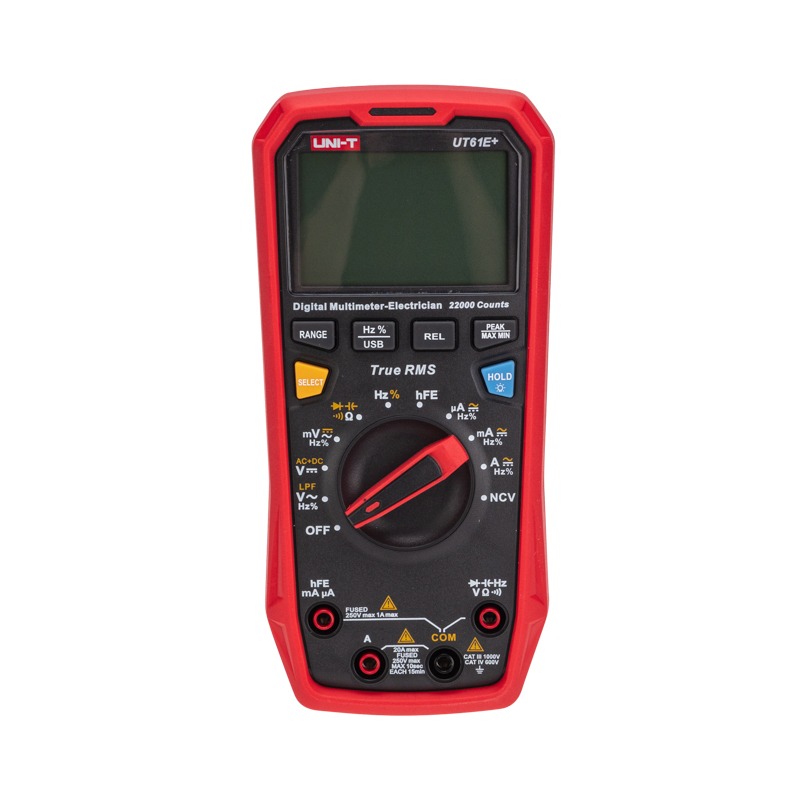 Профессиональный TRUE RMS мультиметр последнего поколения UNI-T UT61E+ с ударопрочным корпусом применяется для измерения постоянного/переменного напряжения, силы тока, сопротивления, емкости и частоты с большим разрешением и точностью.<br> Присутствует фильтр низких частот для переменного напряжения и аналоговая шкала. Большой дисплей на 22 000 разрядов с подсветкой облегчает считывание результатов при слабом внешнем освещении. Функция удержания данных обеспечивает удобство при работе в местах с ограниченным доступом. Выбор диапазона измерения производится автоматически или вручную.<br> В устройстве предусмотрена прозвонка межсоединений со звуковым сигналом, подсветка дисплея, диодный тест, защитный холстер и тест транзисторов. Во всех приборах серии имеется USB интерфейс и кабель для работы с ПК.<br> Прибор имеет режимы относительных, максимальных/минимальных измерений. Оснащен функцией сохранения показаний DATA HOLD, индикацией режима измерений и разряда батареи.<br> <br> Технические характеристики UNI-T UT61E+:<br> Постоянное напряжение: 220 мВ/1000 В ± (0.05%+5)<br> Переменное напряжение: 220 мВ/1000 В ± (0.8%+10) ± (2.0%+30)<br> Постоянный ток: 220 мА/20 А ± (0,5%+10)<br> Переменный ток: 220 мА/20 А ± (0,8%+10) <br> Сопротивление: 220 Ом/220 МОм ± (0,5%+10)<br> Емкость: 1 пФ-220 000 мкФ ± (3%+5)<br> Частота: 0,001 Гц-220 МГц ± (0.01%+5)<br> Коэффициент заполнения (скважность): 0.1~99.9 % ± (2%+5)<br> Питание: 4х1.5В AAA<br> Размеры: 190х90х50мм<br> Вес: 0.350 кг<br> Комплектация: мультиметр, позолоченные щупы, переходник для транзисторов, кабель USB с переходником к мультиметру, батарея, инструкция по эксплуатации, программное обеспечение и инструкция по его установке.