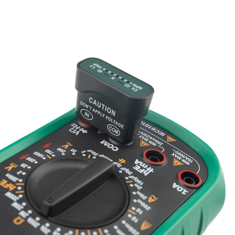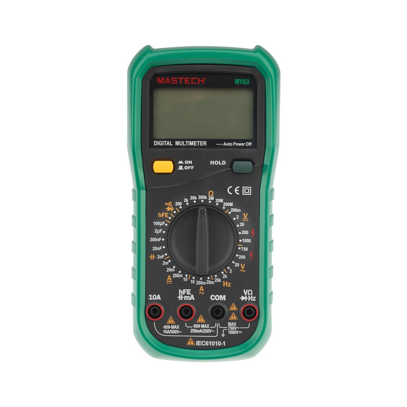 Мульти́метр — электроизмерительный прибор, который включает в себя несколько функций и набор измеряемых параметров. Прибор MY63N относится к обновленной серии N, что отразилось на внешнем и внутреннем дизайне, ряде параметров и улучшенной схемотехнике, добавлена функция памяти данных на экране.. Все приборы серии MY измеряют постоянное и переменное напряжение, постоянный и переменный ток, сопротивление в цепи, емкость, частоту, проверить транзисторы. А также, с помощью прибора MY63N можно проводить тестирование диодов, прозвонку целостности цепи и измерение коэффициента усиления транзисторов. <br> Прибор имеет функцию удержания результата измерений DATA HOLD для тех случаев, когда измерения проводятся в труднодоступных местах и не всегда есть возможность взглянуть на экран. <br> Прибор MY63N является полноразмерным универсальным мультиметром обновленного форм-фактора с широким функционалом, с большим ручным выбором диапазонов измерений , который можно использовать практически в любой сфере деятельности.<br> Инженеры старались сделать прибор максимально удобным для использования. Выбор измеряемых величин и пределов измерений производится с помощью усиленного поворотного регулятора, благодаря которому исключается возможность случайного нажатия. Прибор изготовлен из высококачественных материалов. <br> Калибровка и тестирование приборов произведено под контролем компании СДС.<br> <br> Характеристики: <br> Разрядность шкалы мультиметра 2000 отсчетов<br> Постоянное напряжение: 200 мВ/2 В/20 В/200 В: ±0.5%, 1000 В: ±0.8%<br> Переменное напряжение: 200 мВ : ±1.2%, 2 В/20 В/200 В: ±0.8%, 700 В: ±1.2%<br> Постоянный ток: 2 мА/20 мА: ±0.8%, 200 мА: ±1.5%, 10 А: ±2.0%<br> Переменный ток: 2 мА/20 мА: ±1.0%, 200 мА: ±0.8%, 10 А: ±3%<br> Сопротивление: 200 Ом/2 кОм/20 кОм/200 кОм/2 МОм: ±0.8%, 20 МОм: ±1.0%, 200 МОм: ±5.0%<br> Емкость конденсаторов: 2 нФ/20 нФ/200 нФ/2 мкФ/100 мкФ: ±4.0%<br> Частота: 2 кГц: ±2.0%, 20 кГц: ±1.5%<br> Коэффициент усиления транзисторов по току: 1-1000<br> Прозвонка соединений<br> Диодный тест<br> Тип батареи: 9В "Крона" (6F22)<br> Комплект поставки: мультиметр, чехол, инструкция