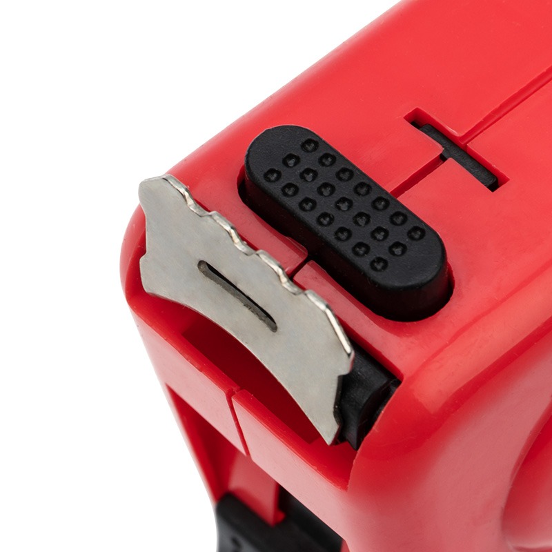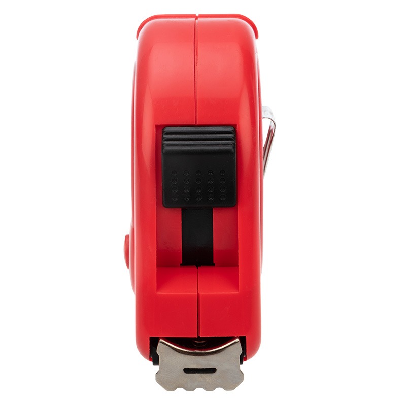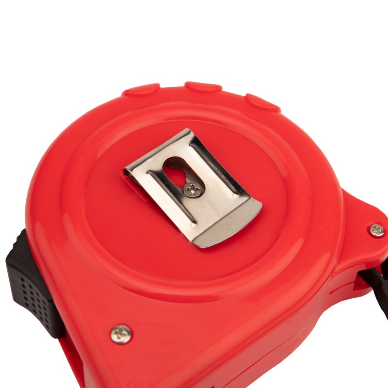 Для удобства использования предусмотрены кнопки стопора и фиксации тормоза. Инструмент оснащен удобным зацепом с отверстием посередине, которое позволяет зафиксировать полотно рулетки на шляпке гвоздя или самореза.