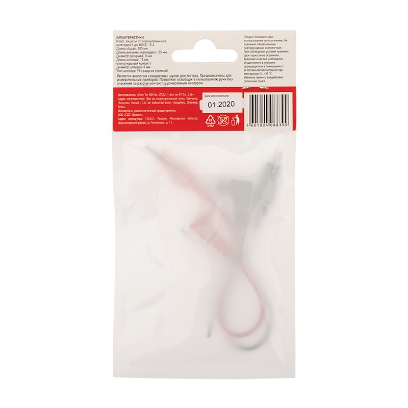 Щупы для тестера и токовых клещей. Щупы подсоединяются к гнездам мультиметра. Щупы для удобства имеют разные цвета; черный и белый. Как правило, черный щуп подключается на общее гнездо, а красный — на гнездо «+». <br> Клеммы, провода и ручки щупов надежно изолированы от поражения электротоком. Для удобства работы металлические концы щупов заострены. <br> Тестирование произведено под контролем компании СДС. <br> <br> Класс защиты от перенапряжения: <br> Категория 3 до 1000 В<br> Длина: 1000 мм<br> Длина рукояти от защитной гарды: 85 мм<br> Длина жала: 18 мм<br> Длина штекера: 20 мм<br> Диаметр штекера: 8 мм<br> Угол штекера: 130 градусов