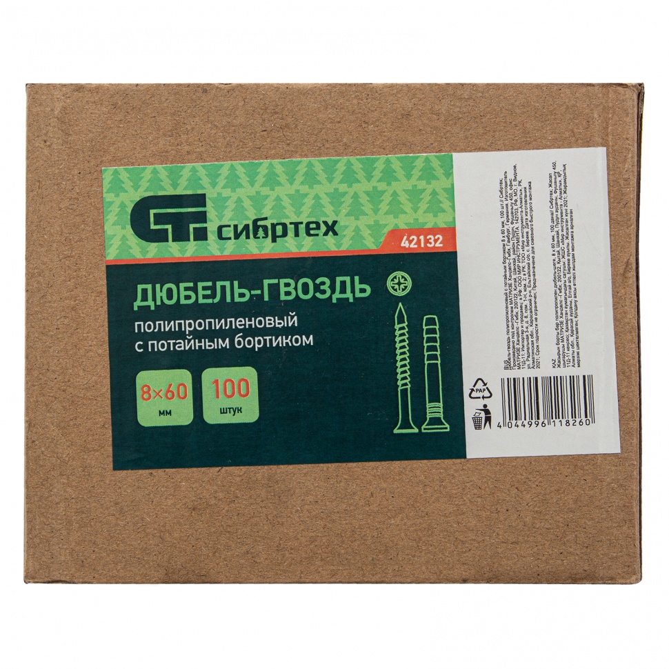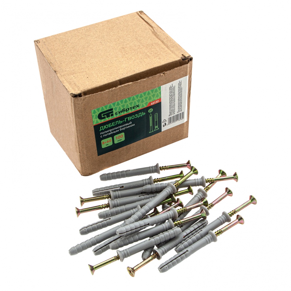 Дюбель-гвоздь полипропиленовый с потайным бортиком 8 х 60 мм, 100 шт Сибртех