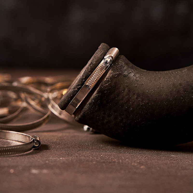 Хомут состоит из ленты с зубчатой дорожкой, корпуса и специального винта для затяжки хомута. Детали червячного хомута имеют цинковое покрытие с хроматированием 6 мкм (бесцветное) по ГОСТ 9301-86.