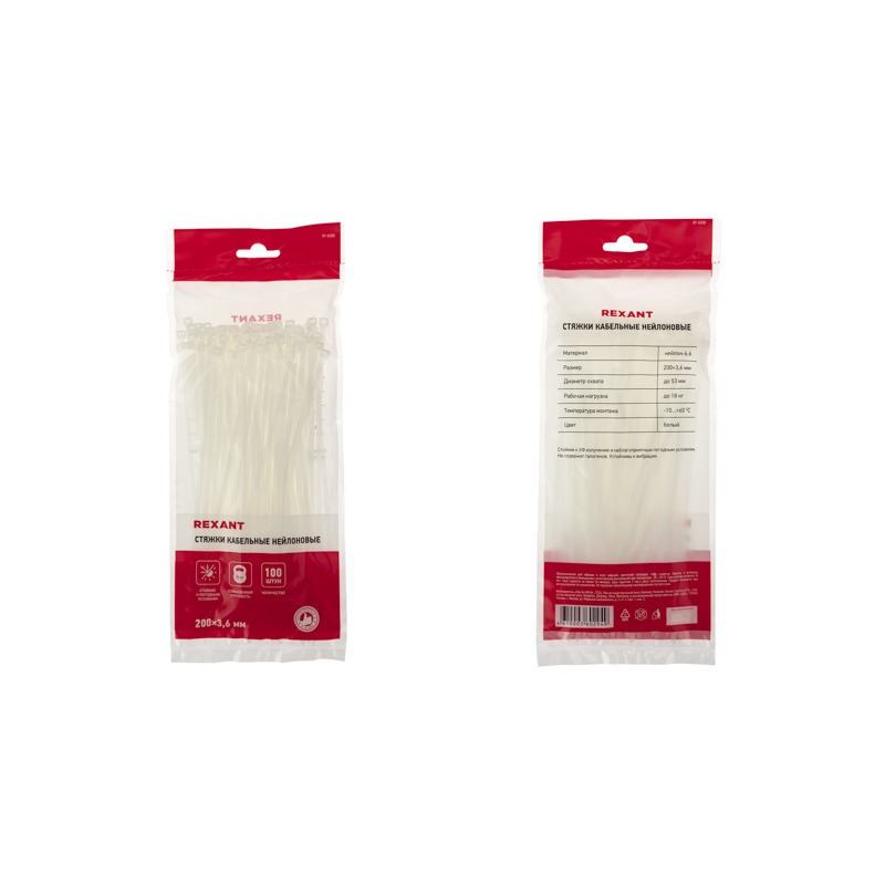 Упаковка комплектуется белыми стяжками размером 200x3,6мм.