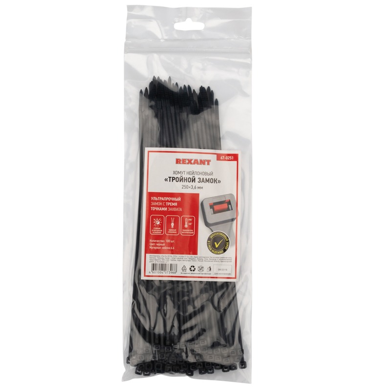 Хомут-стяжка нейлоновая с тройным замком 250x3,6мм, черная (100 шт/уп) REXANT