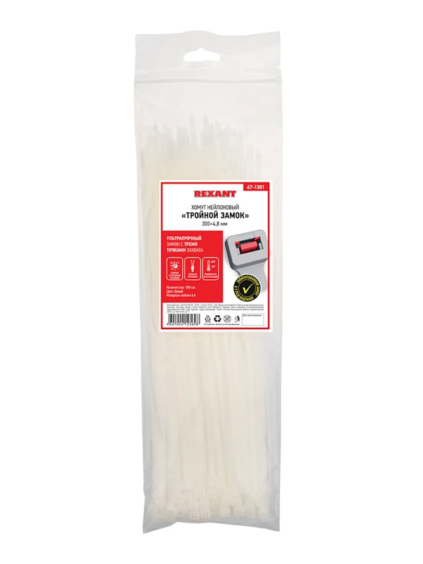 Хомут-стяжка нейлоновая с тройным замком 300x4,8мм, белая (100 шт/уп) REXANT