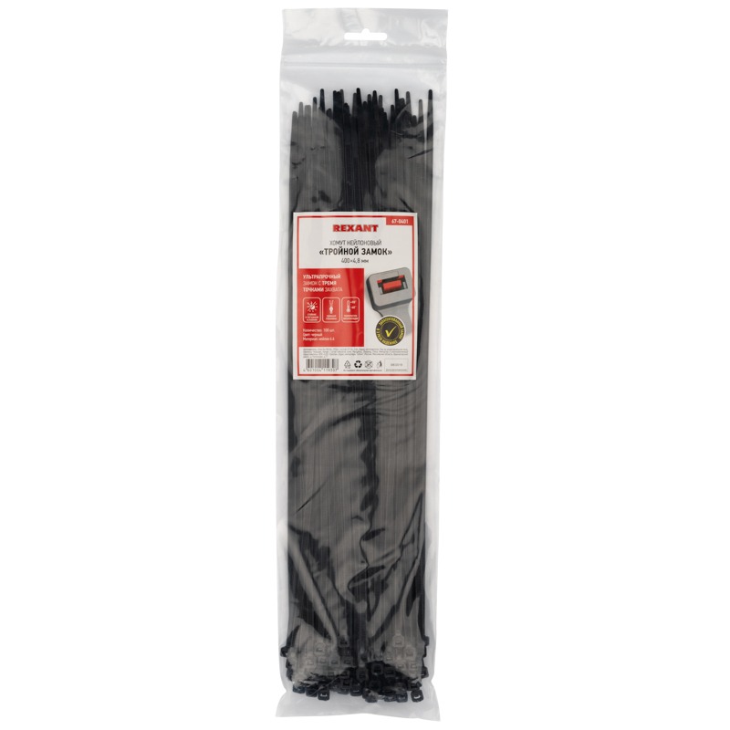 Хомут-стяжка нейлоновая с тройным замком 400x4,8мм, черная (100 шт/уп) REXANT