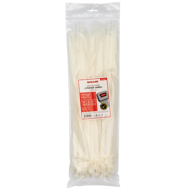 Нейлоновая хомут-стяжка с тройным замком – это высококачественное крепежное изделие, предназначенное для фиксации проводов, кабелей и труб в нужном положении, а также организации кабельных систем.<br> Представляет собой белую нейлоновую полоску с высоким уровнем гибкости размером 500x7,6 мм. Стяжка изготовлена из нейлона-6,6, износостойкого и прочного материала. <br> Данный вид хомутов на 30% крепче своих аналогов, так как оснащен двусторонним полотном с зубчиками и уникальным замком с тремя точками контакта.<br> Изделия упакованы в герметичные пакеты многоразового использования с замком Zip-Lock. Этот тип упаковки обеспечивает удобное хранение и защиту от пыли, а также предотвращает потерю влаги. Стяжки упакованы в наборы по 100 штук. <br> Установка хомутов может выполняться вручную или с помощью специального монтажного пистолета (арт. 12-4524, 12-4521 и 12-4541).