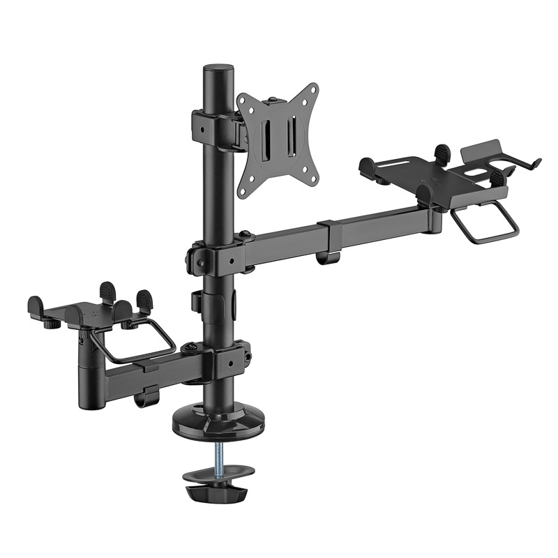 Кронштейн используется для фиксации кассового оборудования с одним монитором (POS-терминала, монитора, принтера чеков, сканера штрихкодов/баркодов)<br> Благодаря возможности регулировки угла наклона до -45°/+45° и угла поворота до -90°/+90°, пользователю доступен широкий диапазон возможных положений для максимального удобства.<br> Минимальная диагональ экрана монитора составляет 17 дюймов, максимальная – 32 дюйма. Максимальный вес монитора – 9 кг.<br> Кронштейн оснащен системой укладки кабеля вдоль корпуса, которая позволяет аккуратно уложить кабель, и тем самым, предотвратить спутывание проводов. Предназначен для настольного монтажа, крепление на струбцине позволяет быстро и легко установить кронштейн на рабочем месте.<br> Изделие поддерживает стандарты VESA 75х75 и 100х100. Цвет – черный.
