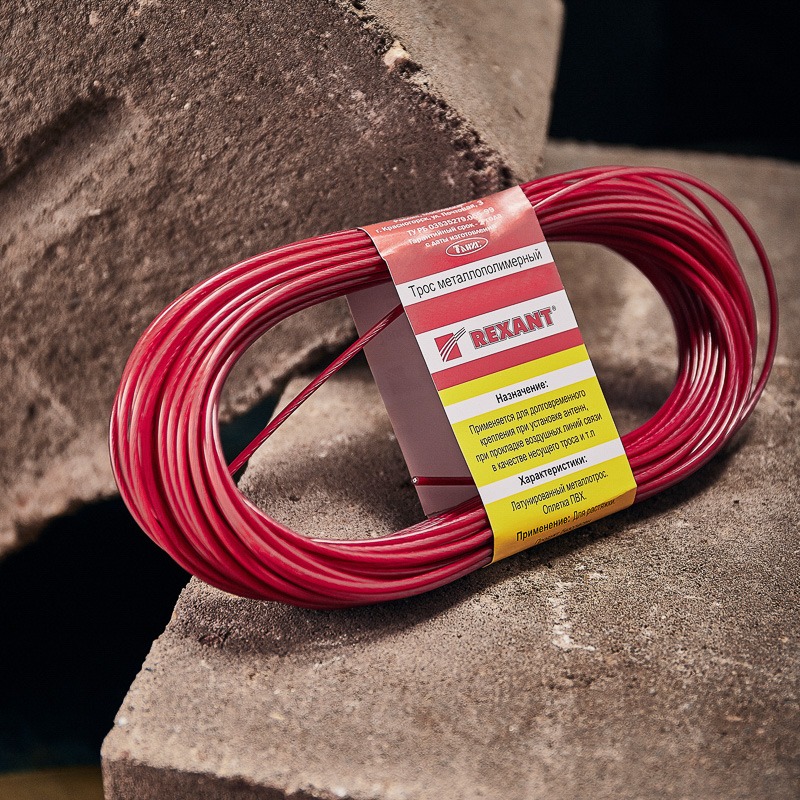 Трос стальной в ПВХ оплетке d=2,5 мм, красный ( моток 20 м) REXANT