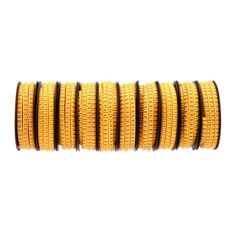Облегчает идентификацию проводов в процессе монтажа и демонтажа проводки. Рабочая температура не должна превышать 85°C. Благодаря специальной эластичной форме каждый маркер надежно фиксируется на проводах с сечением в диапазоне 3.6 -7.4 мм. На одном ролике 500 цифр.