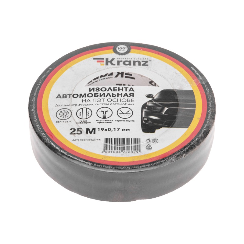 Автомобильная изоляционная лента KRANZ предназначена для жгутования проводов в моторном отсеке и салоне автомобиля. <br> Выполнена на основе полиэстера с высококачественным клеевым акриловым слоем.<br> Обеспечивает защиту от негативного воздействия экстремальных температур, дополнительную шумоизоляцию и защищает от механических повреждений. <br> <br> Цвет: черный<br> Материал: полиэстер <br> Клеевая основа: акрил <br> Ширина: 19 мм <br> Длина: 25 м <br> Толщина: 0,17 мм <br> Адгезия к стали: 5,4 Н/см <br> Удлинение при разрыве: 40% <br> Предел прочности на разрыв: 175 Н/см <br> Рабочая температура: -55...+125 °С <br> Гарантийный срок эксплуатации - 7 лет<br> Гарантийный срок хранения - 7 лет