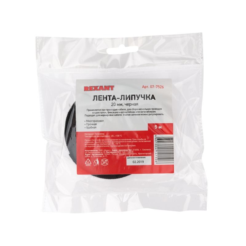 Лента-липучка многоразовая 5 м х 20 мм, черная (1 шт/уп) REXANT