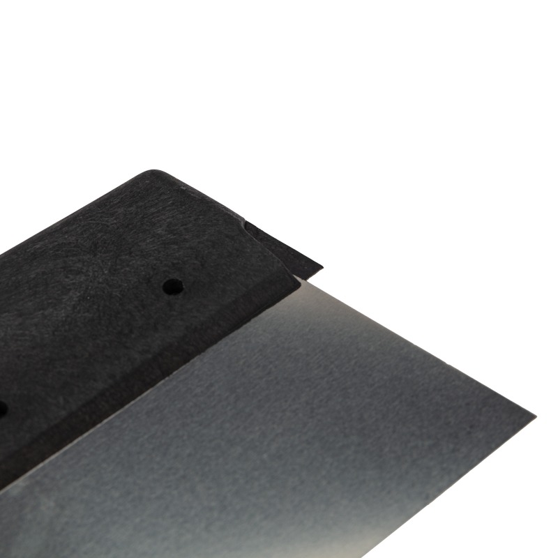 Фасадный шпатель оснащен эргономичной пластмассовой ручкой с рифлением, которая обеспечивает надежный хват инструмента, при использовании, в том числе, в грубых строительных перчатках. Основной рабочей частью шпателя является металлическое полотно, поэтому для производства шпателей мы используем нержавеющую сталь марки AISI 201 толщиной 0,4 мм высоконагартованную (1500 н/мм). Сталь данной марки обладает улучшенными механическими свойствами, исключающими деформацию полотна в процессе работы.