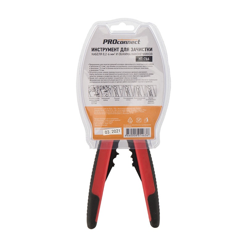 Инструмент PROconnect HT-766 (HY-371) предназначен для зачистки внешней изоляции одножильного и многожильного кабеля в диапазоне 0.2-6.0 мм², для обжима изолированных и неизолированных наконечников в диапазоне 1.5-6.0 мм² и обжима контактов высоковольтных проводов зажигания в диапазоне 7.0-8.0 мм². <br> <br> Особенности:<br> - Корпус выполнен из качественной инструментальной стали.<br> - Регулятор усилия зажима провода позволит оптимально настроить инструмент.<br> - Ограничитель длины зачистки провода и возвратная пружина для обеспечения обратного хода рукояток. <br> - Данный инструмент осуществляет обрезку проводов. <br> - Эргономичные противоскользящие рукоятки с резиновыми вставками обеспечат правильное расположение инструмента в руке и сделают работу максимально простой и приятной.