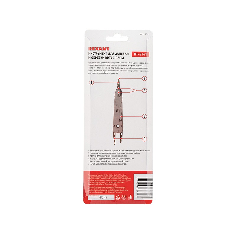 Инструмент REXANT HT-3141 предназначен для заделки и обрезки проводников во врезные контакты на кроссах, патч-панелях, розетках и модулях, заделки контактов 110 типа и типа KRONE.